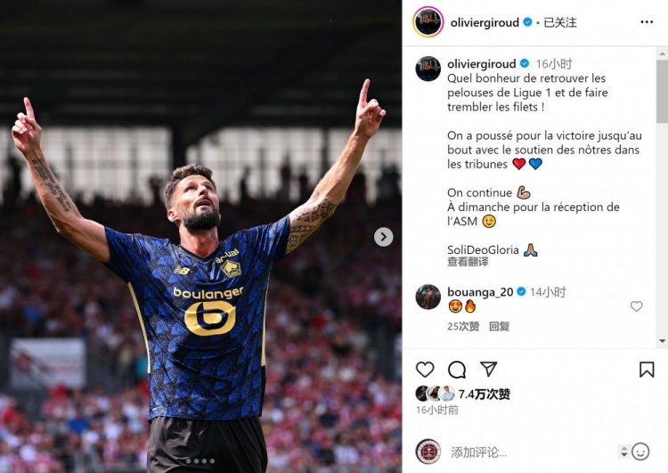 2025世界俱乐部杯-首秀破门⚽吉鲁社媒:回到法甲赛场并进球真是太开心了!