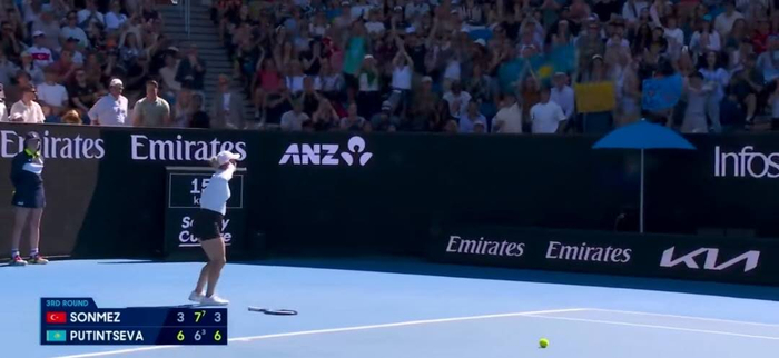 普丁塞娃与土耳其球员森梅兹的这场比赛从一开始就充满火药味。比赛过程中,明显支持本土球员的土耳其球迷不断用嘘声和咳嗽声干扰普丁塞娃。这惹怒了向来脾气火爆的哈萨克斯坦姑娘,她在最后一分结束后,情绪直接爆发了。